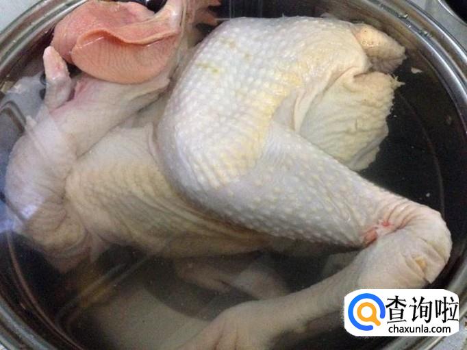 接下来我们需要把老母鸡切成块,炖鲍鱼汤的话半个老母鸡的量就够了,我们要把老母鸡放入开锅的水里焯去浮沫、去除血腥味的话可以加入姜片。