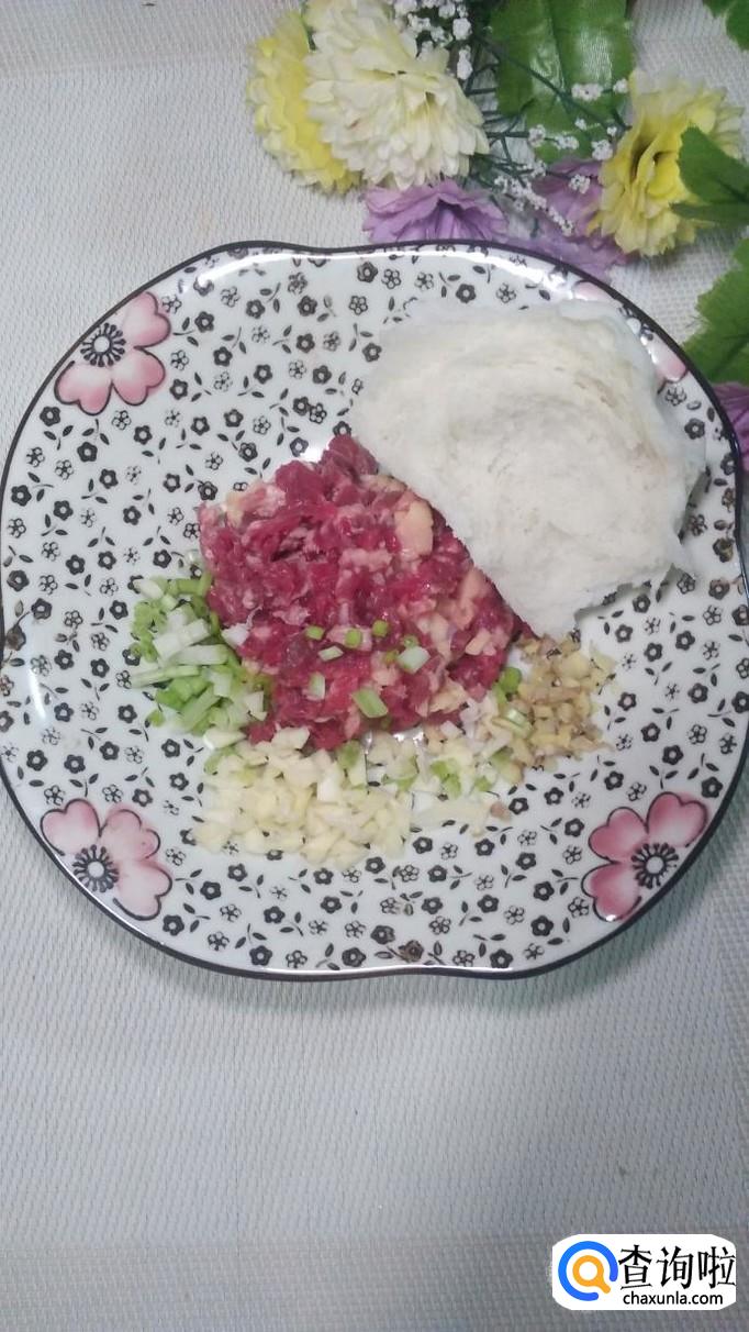 牛肉适量,淀粉适量,面粉适量,葱适量,姜适量,蒜适量,馒头一个,盐适量,鸡精适量,五香粉适量,十三香适量。
