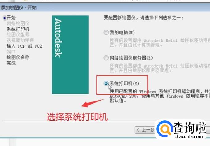 然后会进入打印机类型的选择界面,我们选择系统打印机选项,如下图所示