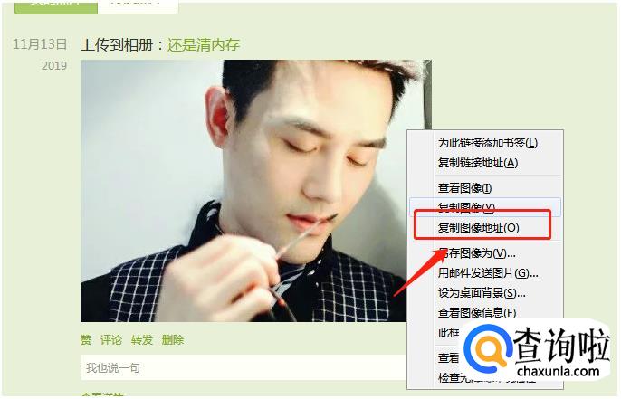 鼠标停留在图片上,点击右键,选择“复制图片地址”。