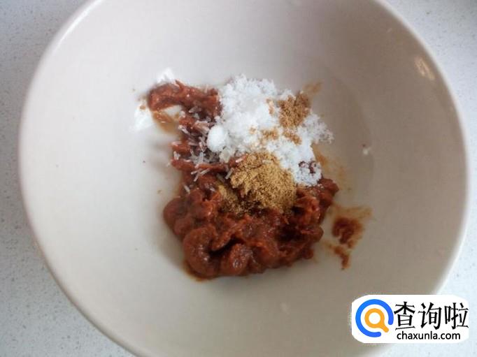 取一匙儿黄豆酱,放入碗中,放入白糖,五香粉,盐,味精,水,搅拌均匀,调制成酱汁。