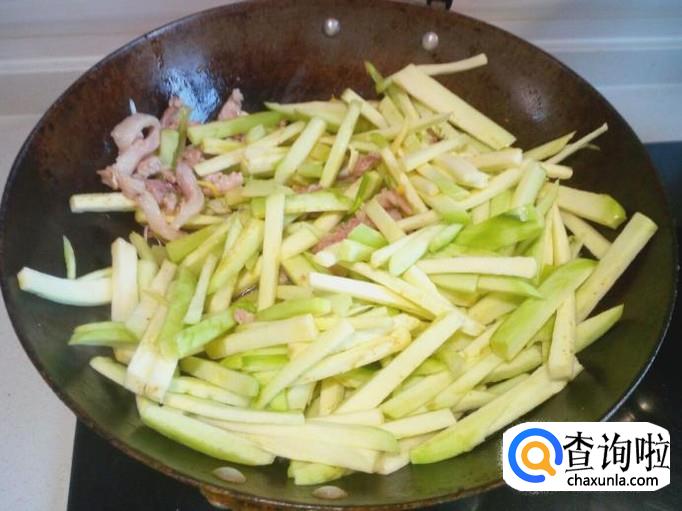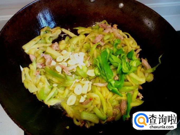 茄条炒至变软后,放入蒜,青椒,略翻炒一下。