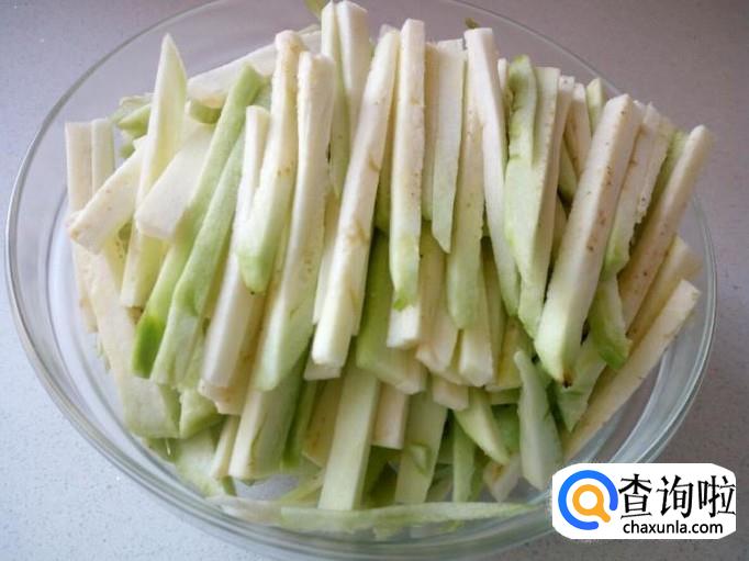 茄子去皮洗净,切成0.5公分左右的条,备用。