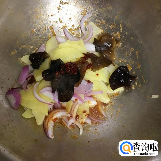 翻炒均匀后,加入洗净的泡发黑木耳。
