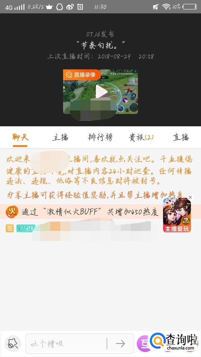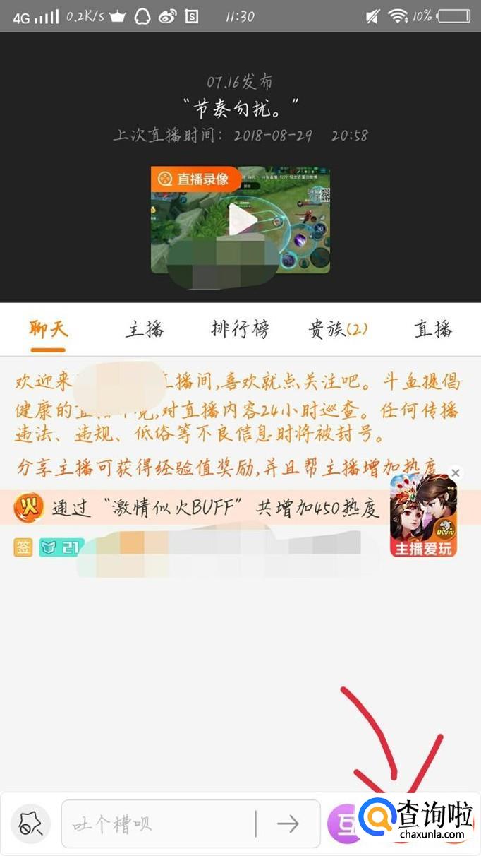 点击主播的头像,如图1箭头所示。会出现一个新的界面,如图2所示。点击“聊天”这个选项,如图3箭头所示。