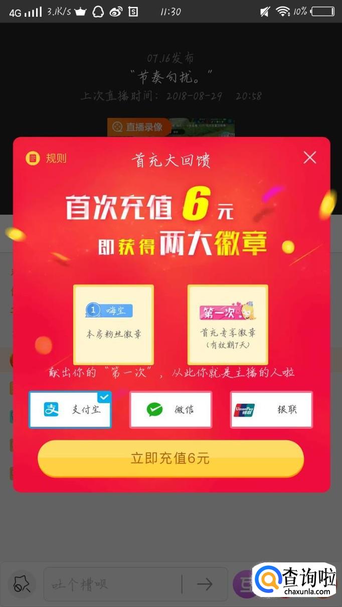 会出现一个新的界面,如图1所示。点击右下角“首充领勋章”这个选项,如图2箭头所示。会出现一个新的界面,选择充值的方式。你就可以得到本团的勋章,成为主播的“人”啦。