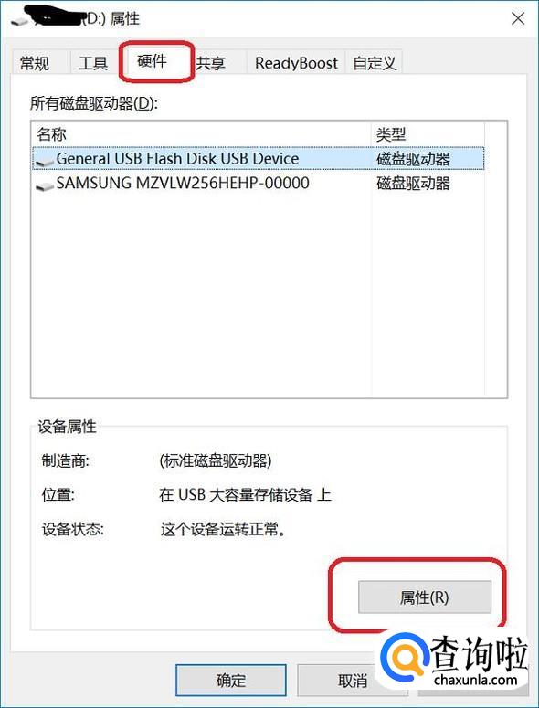 点击了“属性”按钮后我们再点击“硬件”按钮,然后再点击右下角的“属性”按钮。