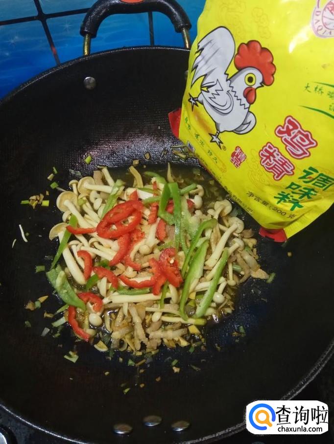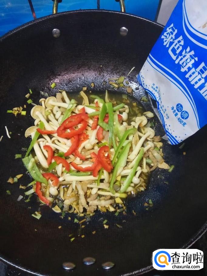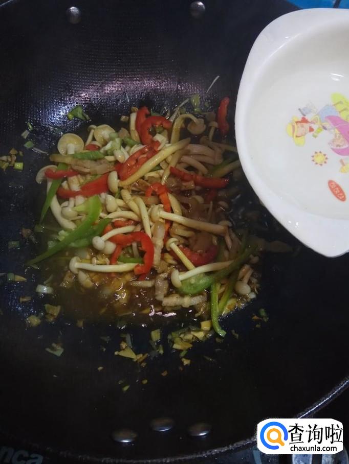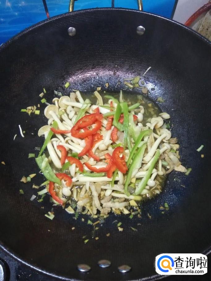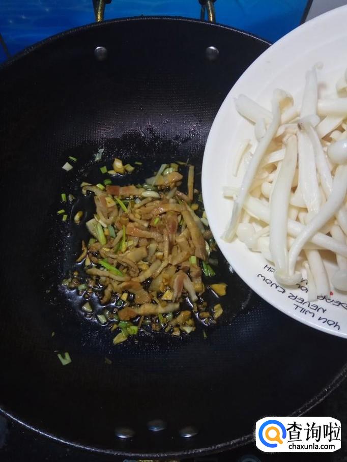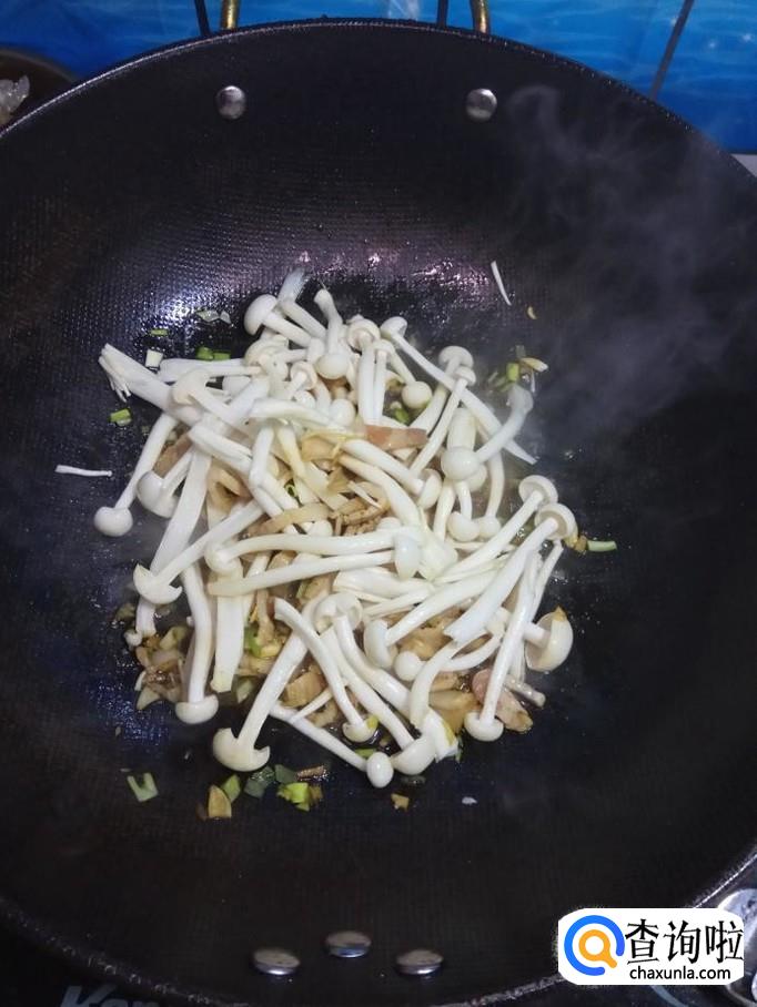 将白玉菇倒入锅中,和五花肉一起翻炒均匀,炒至白玉菇出水变软,就差不多了。