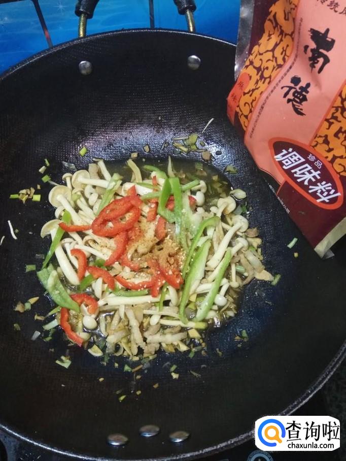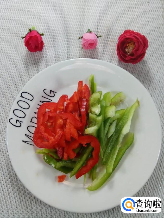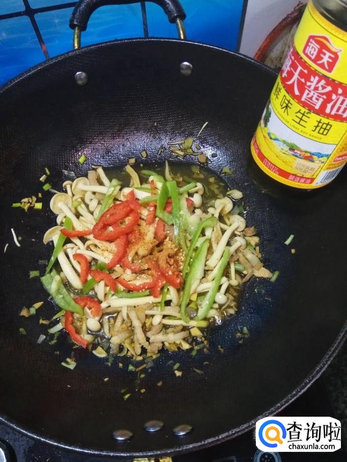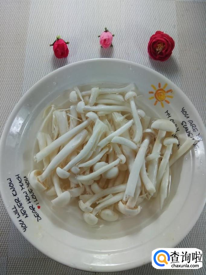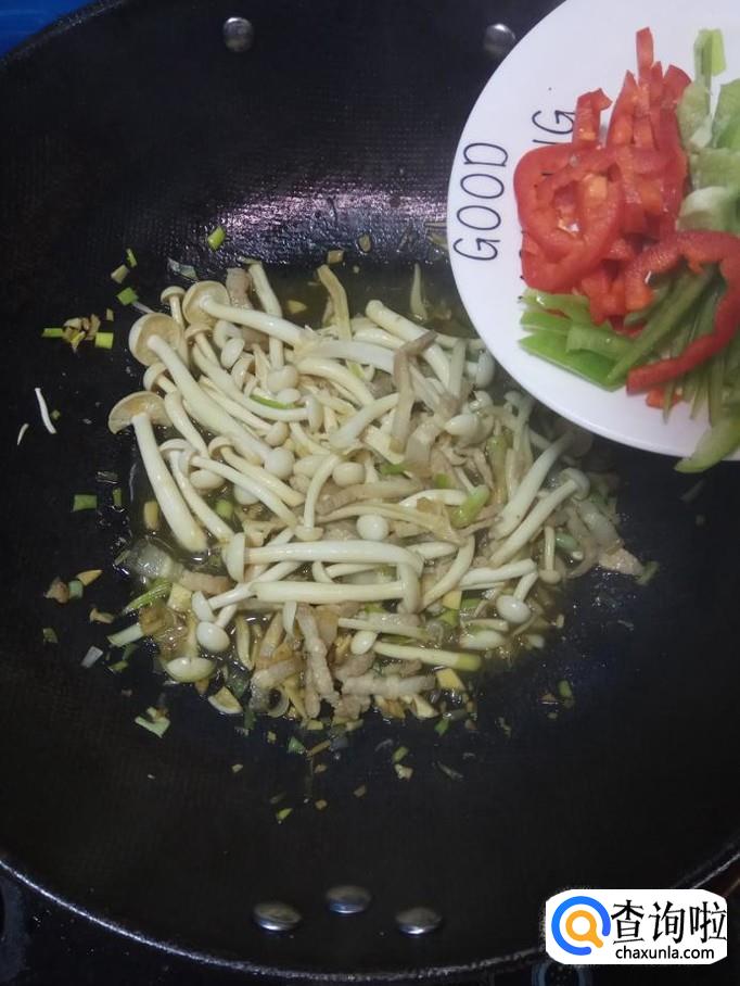准备适量白玉菇,洗净后,放入盘中备用,再准备适量青红椒,洗净后,切丝备用。