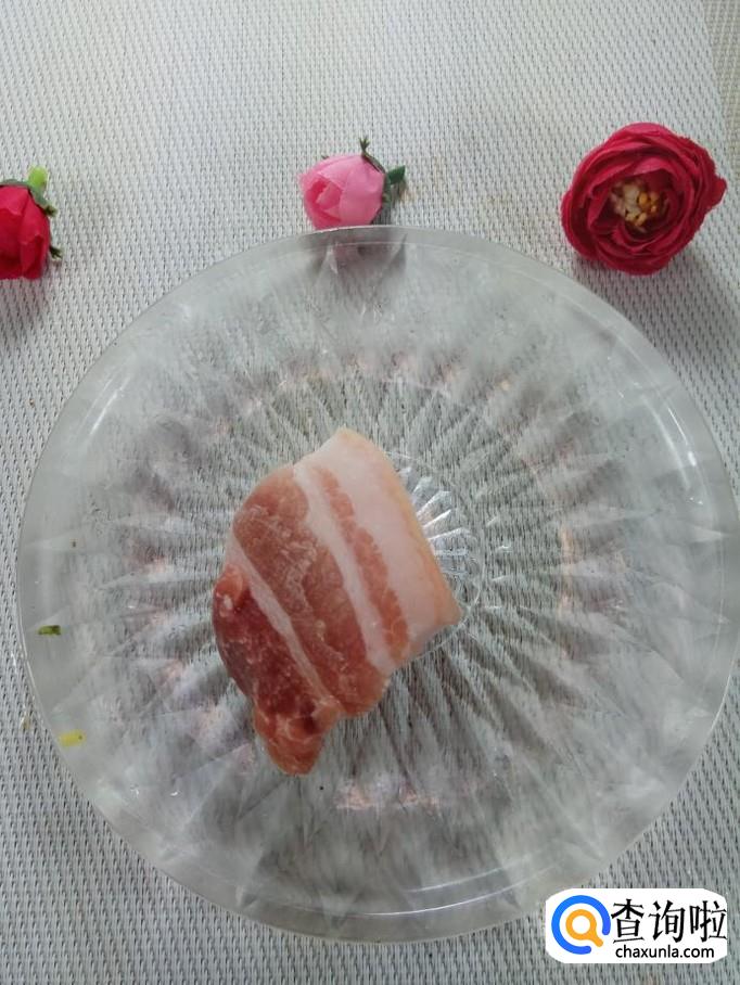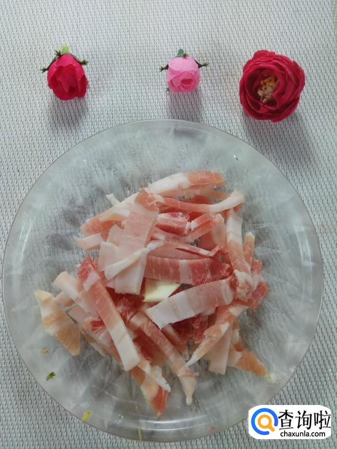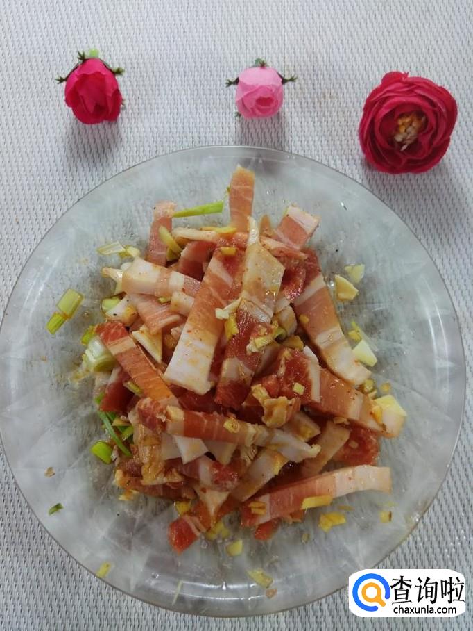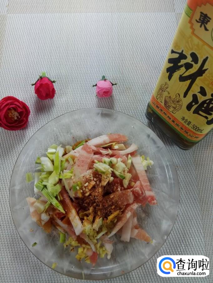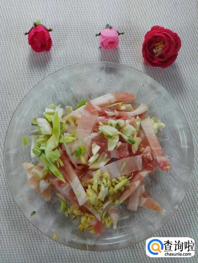 准备适量五花肉,洗净后切成丝,再准备适量的葱,姜,蒜,洗净后,切碎放在上面。