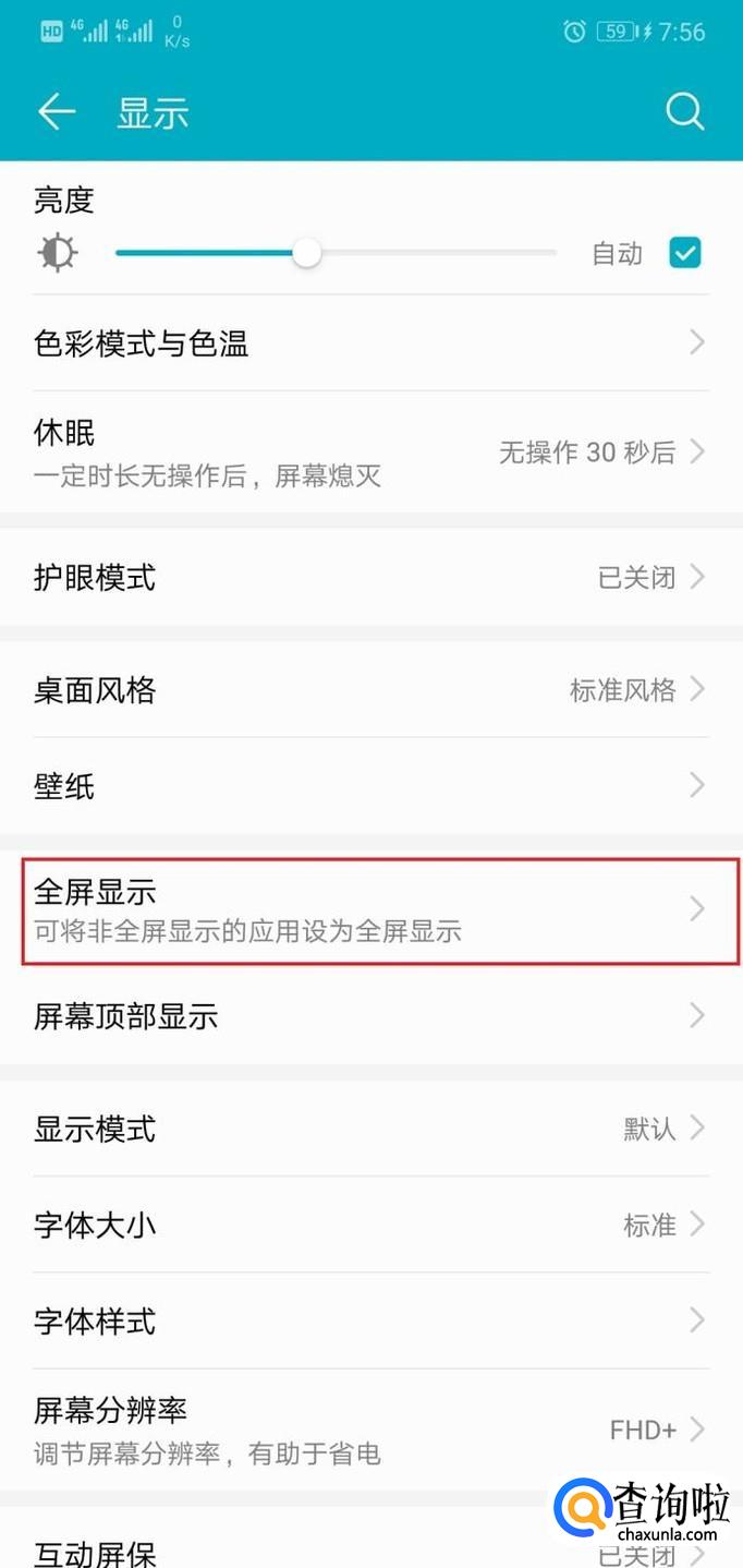 在显示界面中,可以更改亮度、壁纸、字体大小等,点击“全屏显示”按钮