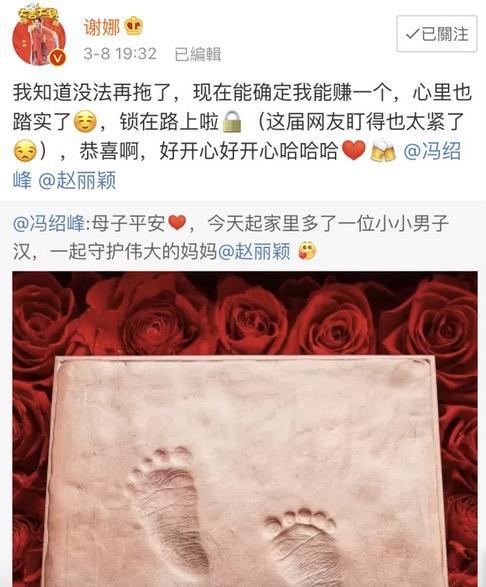 3月8日,赵丽颖丈夫冯绍峰官宣赵丽颖生子,母子平安,众人在送上祝福之余,也不忘喊话谢娜:“记得还锁”。