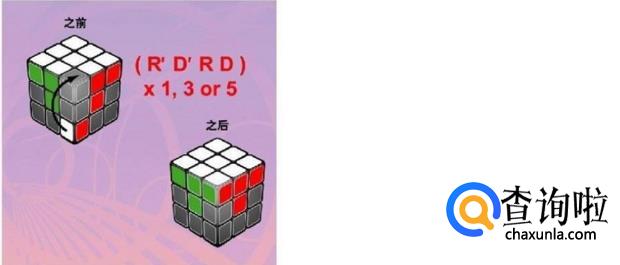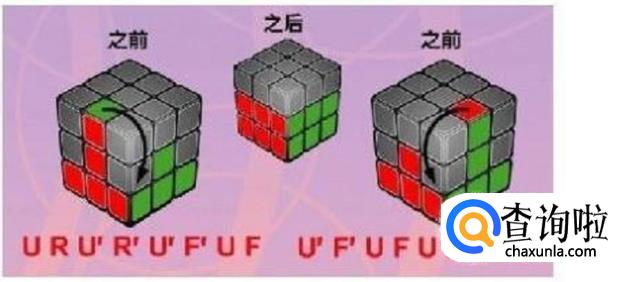 第三步,然后让中间块归位。把白色面转向下,然后找出红绿边块。如果红绿边块在顶部,则顺时针方向转动顶层,直到边块与图上的一个情况相同。再按照口诀转动魔方,使边块归位。若红绿边块在中间某层,但位置错误或颜色错误,则先使红绿边块在右上方位置,再重新按照下面其中一个次序重新旋转一次。