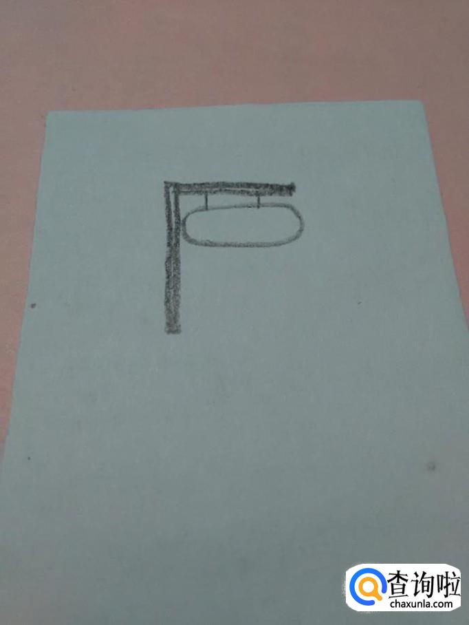 在横杆上画两条竖线,在竖线下面画一个椭圆形,表示挂红绿灯的灯牌。