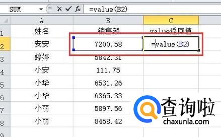 在“value的返回值”下面的单元格中,输入公式“=value(B2)”。