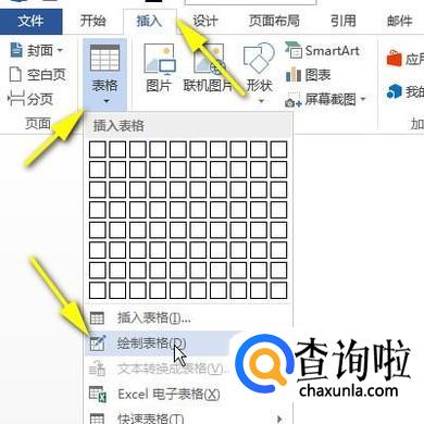 在文档上方的主选项卡这里,点击“插入”选项卡,下面展开相关内容;再点击“表格”下拉按钮,弹出的面板中再点“绘制表格”。