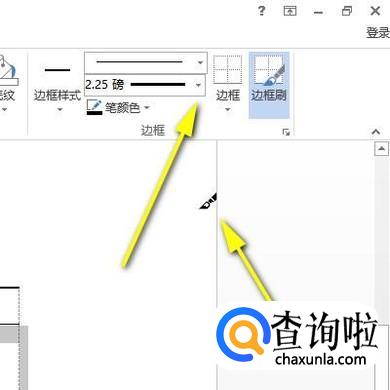 继续保持表格在选中状态,鼠标再移到“设计”选项卡,点开“设计”选项卡,在下面的内容中,设置笔划粗线为2.25磅;此时,鼠标即变成一支像是毛笔的形状。接着,鼠标移到上面第一条线这里,点击一下,设置为2.25磅的线条。