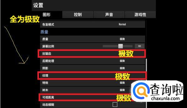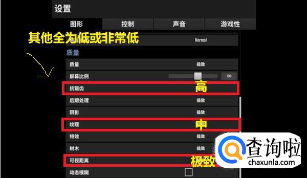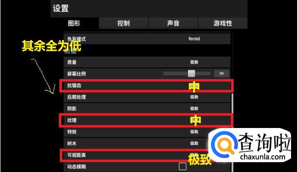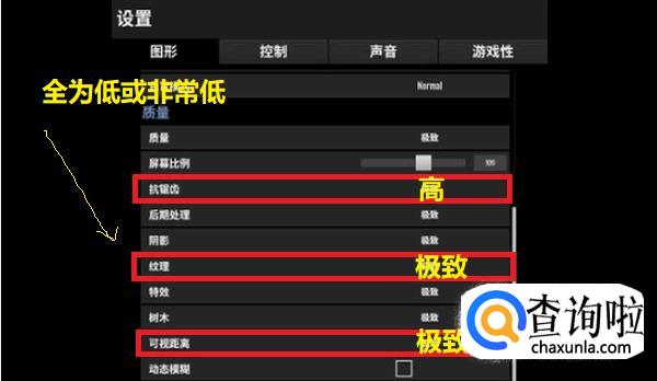 高配电脑:可视距离调到“极致”,抗锯齿调为“高”,纹理调为“极致”,其余的可以调为“低或非常低”。