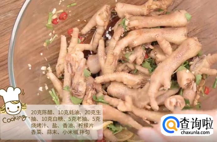 过完冷水后,将鸡爪装在碗中,再加入20克陈醋、10克蚝油、20克生抽、10克白糖、5克老抽、5克烧烤汁,还有适量的盐、香油、柠檬片、香菜、蒜末、小米椒,一起搅拌均匀。