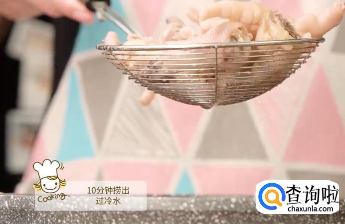 煮10分钟后,将鸡爪捞出来,过一下冷水。