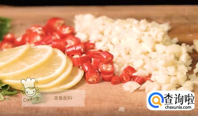 接下来准备配料,将柠檬和姜切成片,再把香菜、小米椒、蒜切成末。