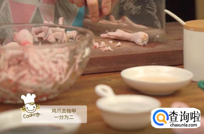 首先,将鸡爪洗干净,然后用刀切掉鸡爪上的指甲,再把鸡爪一分为二。切好的鸡爪放在碗里备用。