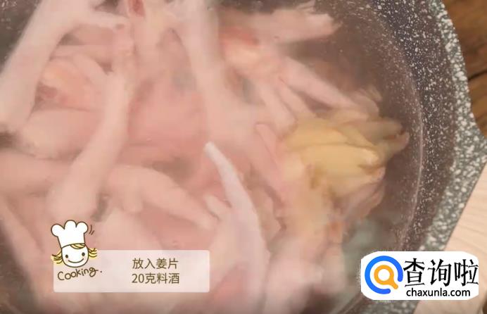 烧一锅水,将鸡爪放入,再加入姜片和20克料酒,一起煮。