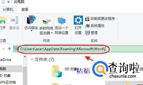 一般而言,默认的位置都是C:UsersacerAppDataRoamingMicrosoftWord,如果感觉这样一步步的进入查找太麻烦,那么我们直接复制这一地址,然后打开“此电脑”,在地址栏输入这个位置也可以;