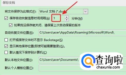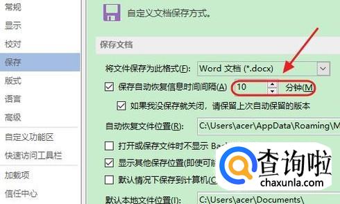然后在弹出的“Word选项”对话框,我们选择左侧的“保存”,然后即可看到系统自动保存时间,小编建议大家将这个时间间隔修改的小一点,尤其是经常要用到word的朋友,最小可以设置为1分钟,如图二;