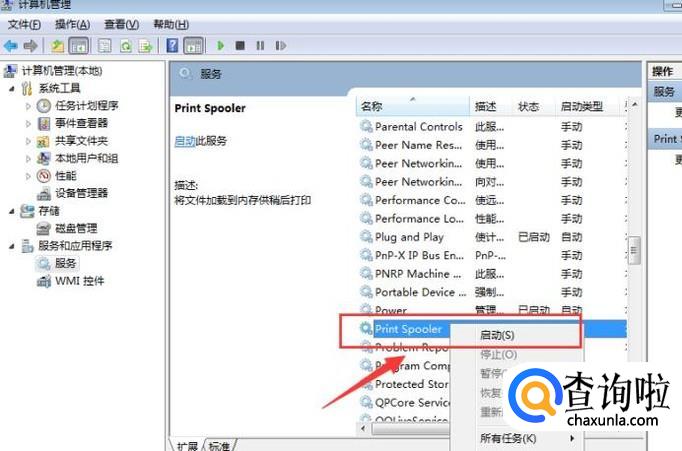 然后在下图的表格中找到print spooler ,选中它右键选择启动就行了。耐心等待开启完成!