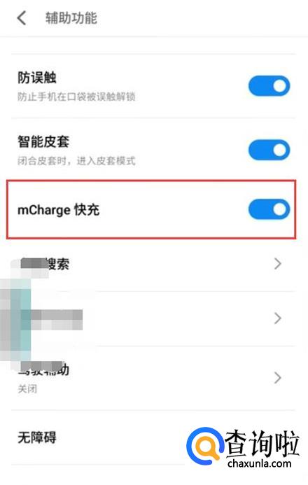 找到“mCharge快充”选项,即可点击开关按钮进行开启或关闭。
