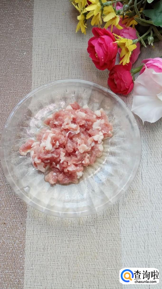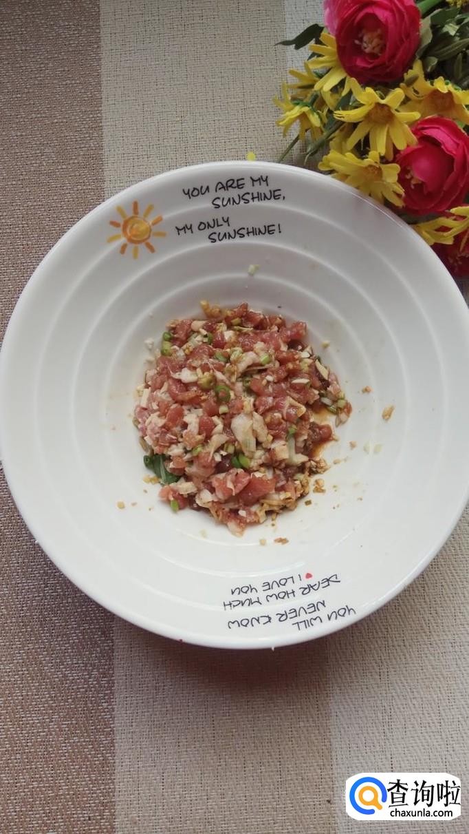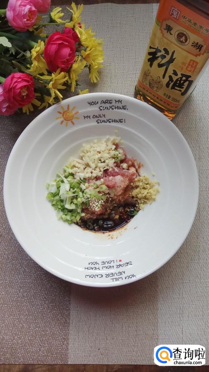 将五花肉洗净后切碎,放入盘中备用,将小葱,蒜和姜也切碎,和五花肉放在一起,放入适量盐,鸡精,五香粉,生抽,料酒,搅拌均匀,腌制15分钟。