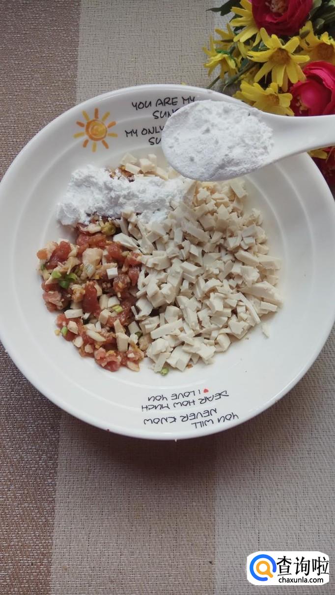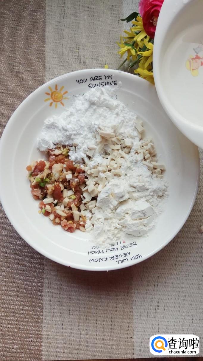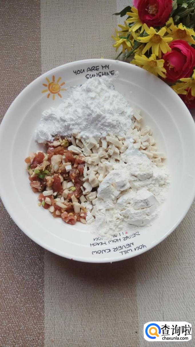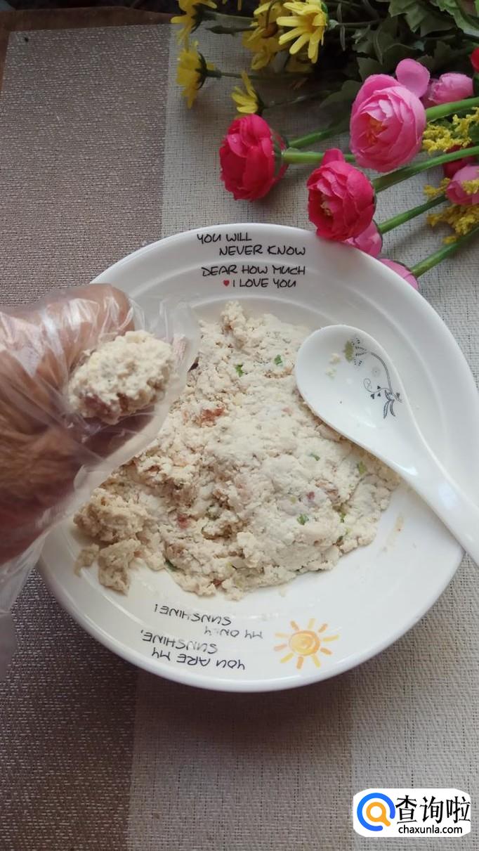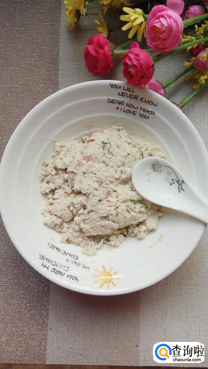 加少许清水,用勺子将豆腐压成泥,和着面粉和淀粉,将豆腐和肉,做成泥状。