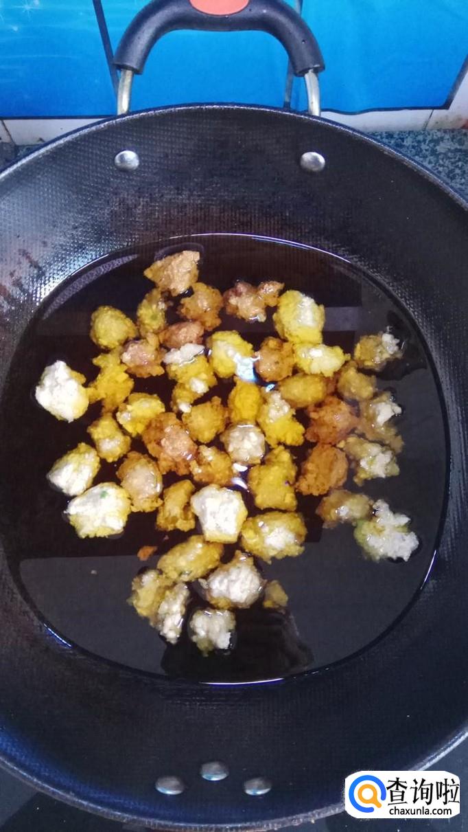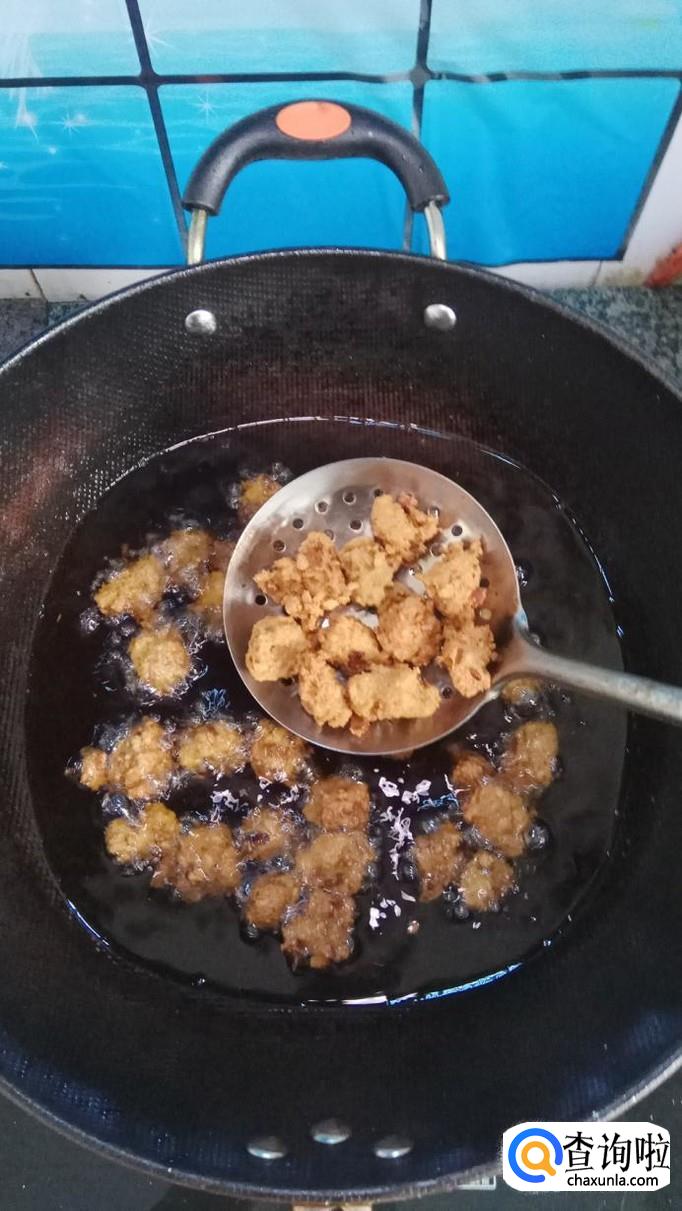 锅中放入适量油,油温五成热,用手捏成丸子状,下入锅中小火慢炸。