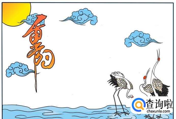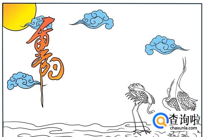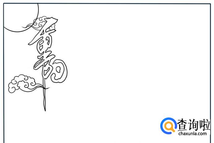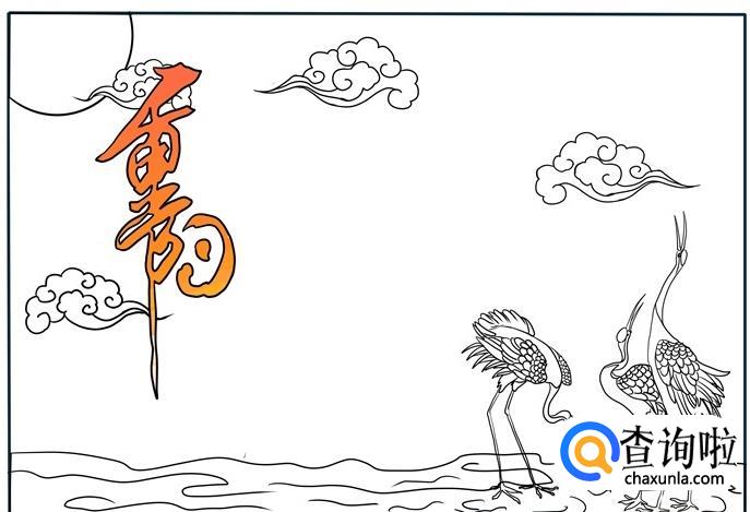 先画一轮明月和几朵云彩,再写上“重阳节”三个艺术字。