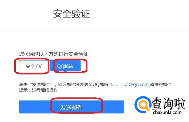 可以看到有两种方法进行验证,即安全手机验证和QQ邮箱验证,我们用QQ邮箱试试,点击发送邮件。