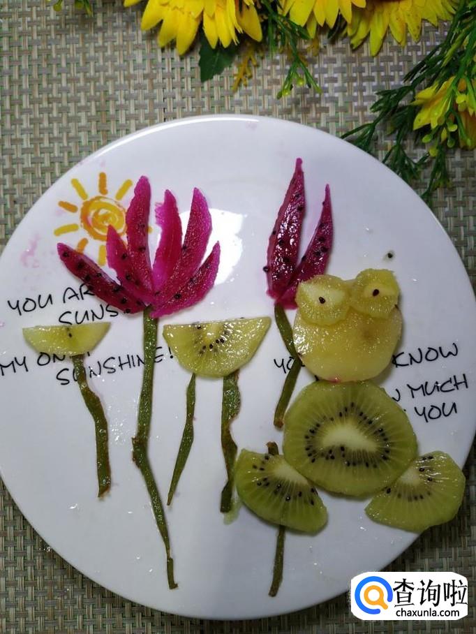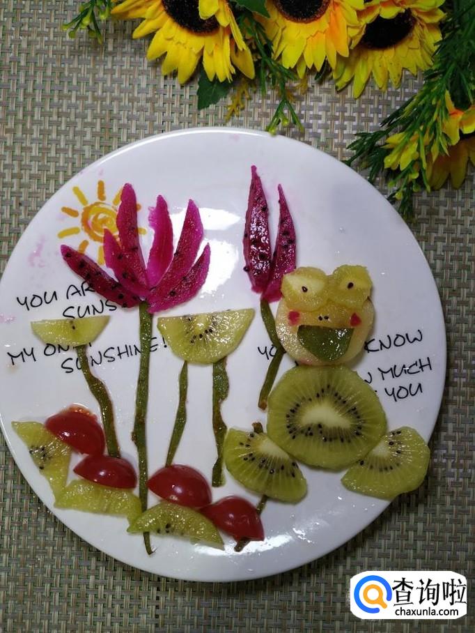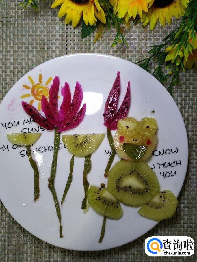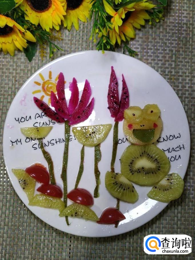 再用猕猴桃片,做出青蛙的腿部,青蛙最喜欢在荷叶丛中跳来跳去。用猕猴桃的皮剪出一个月牙形,做成青蛙的嘴巴,再用火龙果在青蛙的脸上点缀一下,做出红脸蛋。