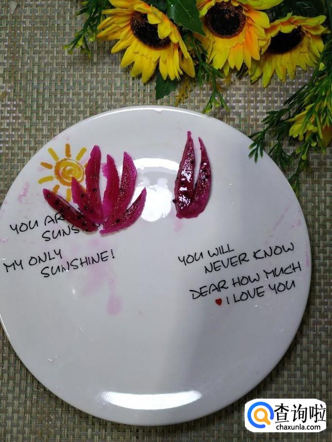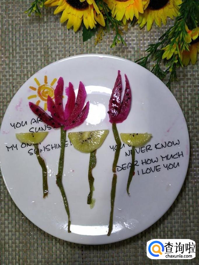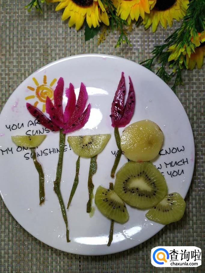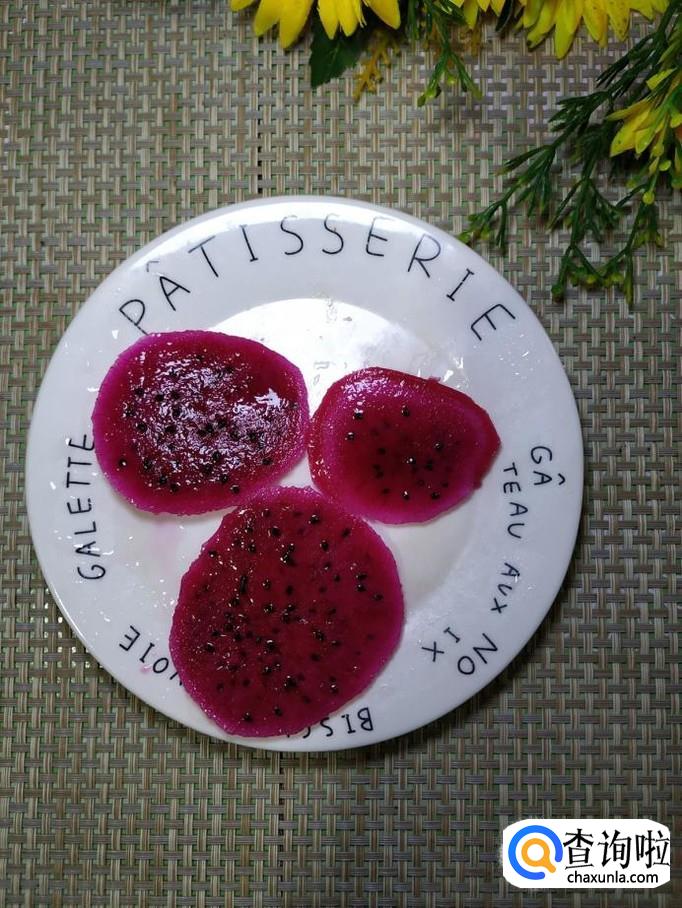 将火龙果先去外皮,然后切成片,可以稍微切厚一些,然后用刀小心的切成月牙形,放入盘中,摆成荷花的形状。