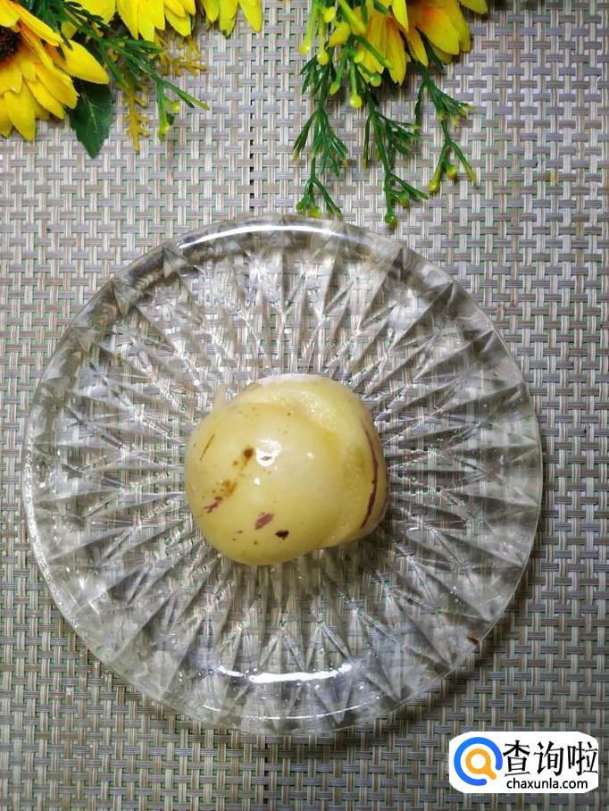 将人参果去皮后切成片,放入盘中,做成青蛙的头部,再用一片猕猴桃,放入盘中,做成青蛙的身体。