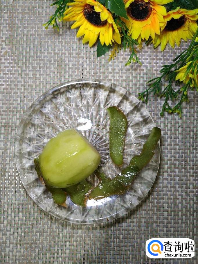 将猕猴桃用削皮刀削去外皮,然后切成片儿,再对半切开,放入盘子中,做成莲蓬。再用猕猴桃的皮做成荷花的茎。