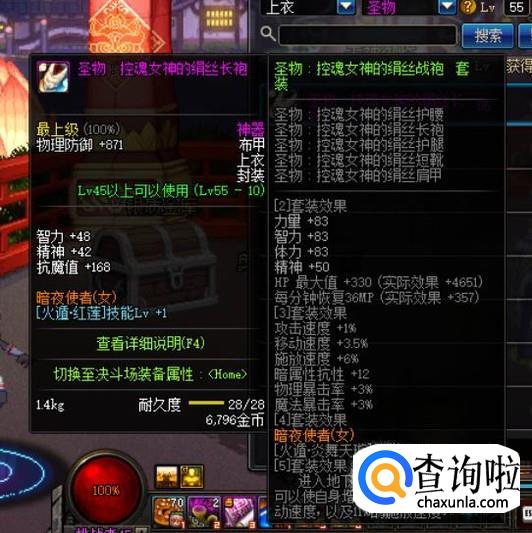 上衣方面,加成最高的自然是武动系列上衣,不过获取有一定的难度,我们可以选择性价比较高的55级圣物布甲“控魂女神的绢丝长袍”,【火遁·红莲】技能LV+1。