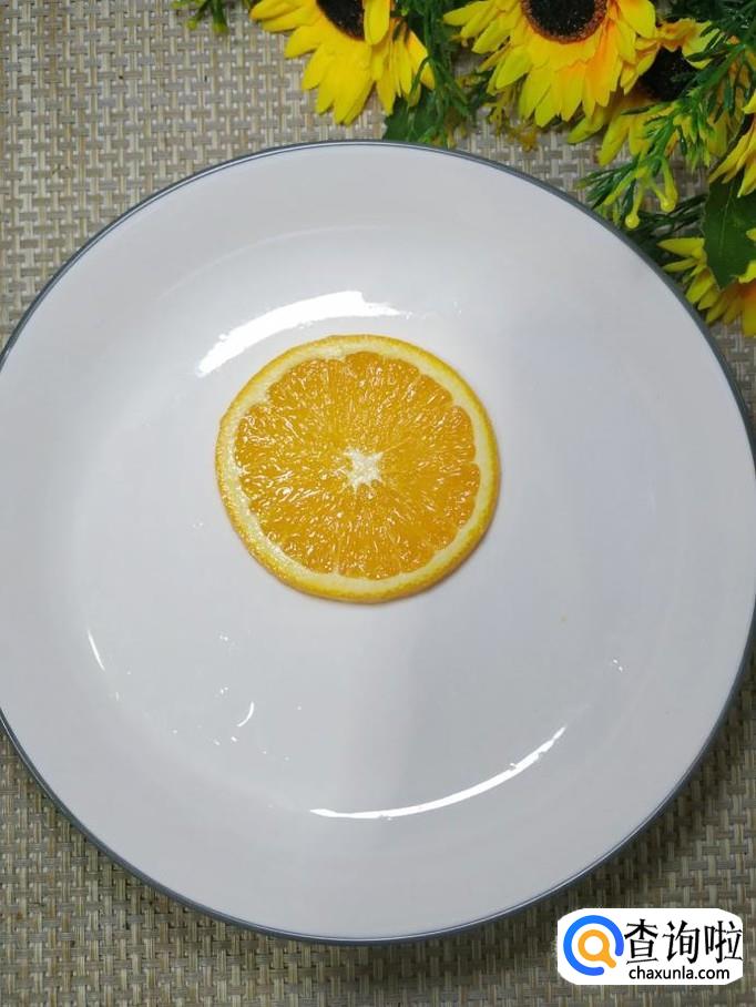将橙子切成薄片儿,选中间的圆片放在盘中,做猫头鹰的头部轮廓。