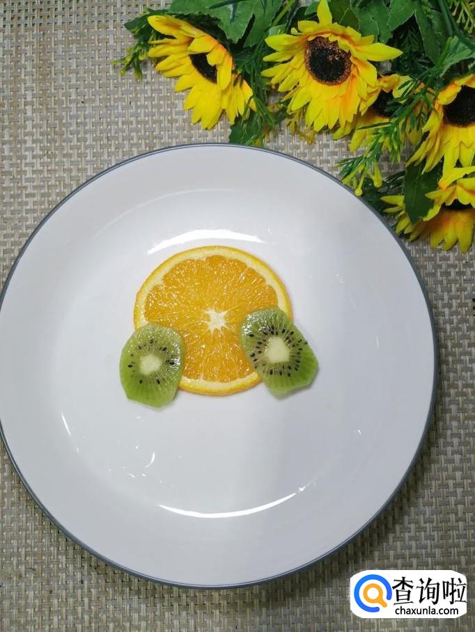 将猕猴桃去皮后切成片,然后切成椭圆形,放在橙子的左右两端靠下的位置,这是猫头鹰的翅膀。