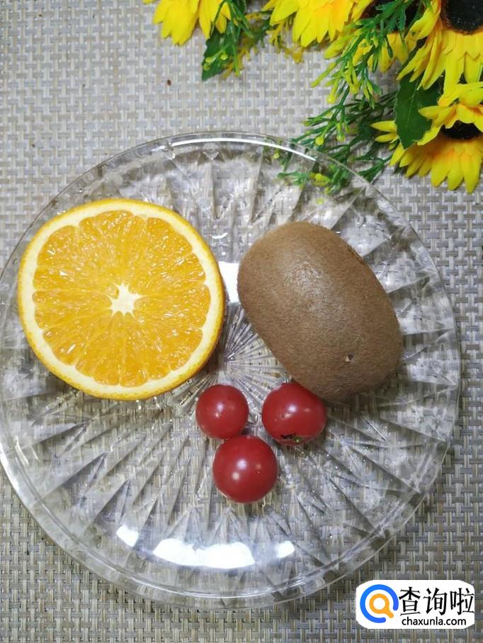 准备适量橙子,圣女果和猕猴桃,洗净后,放入盘中备用。
