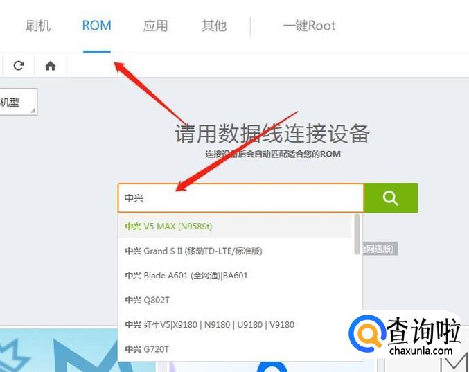 手机连接成功后,我们点击“rom”通过搜索的方式快速查找我们的手机型号。