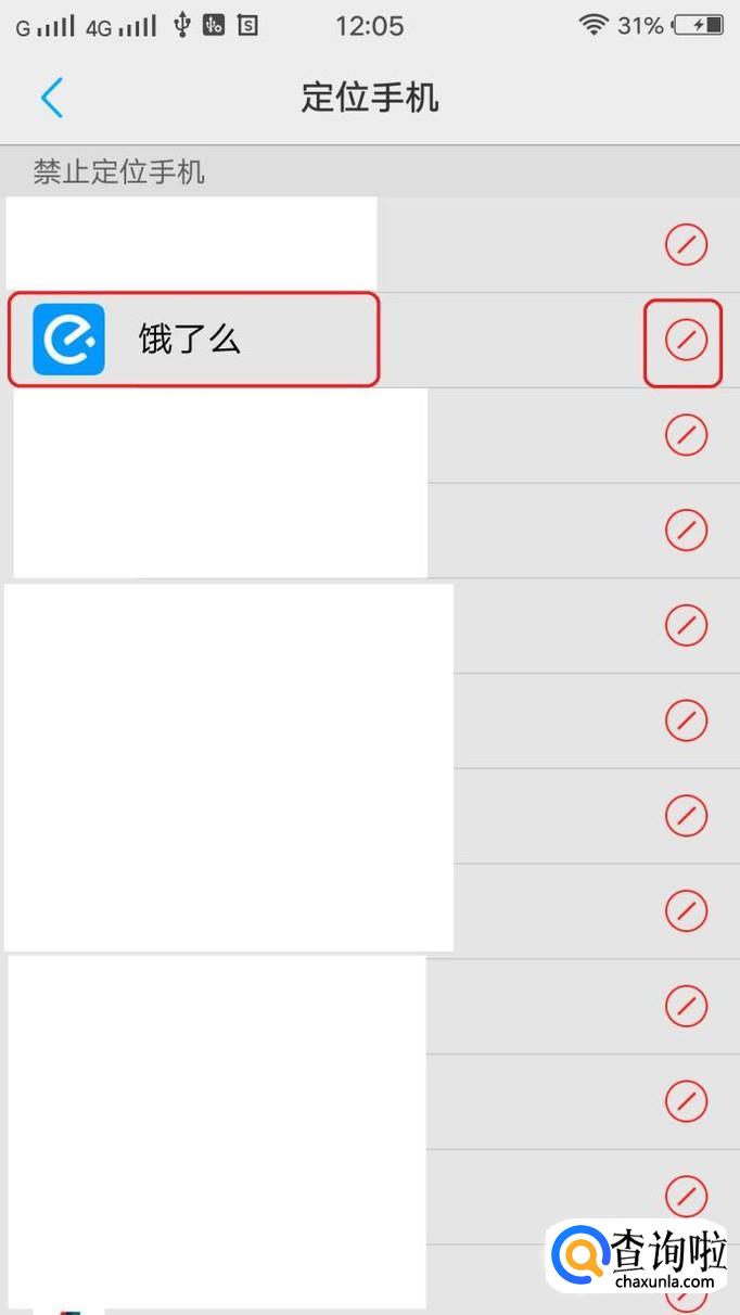 可以看到饿了么app处于“禁止定位”的行列里,如图所示,点击右侧的禁止图标,把权限由“禁止”改为“允许”就可以了。