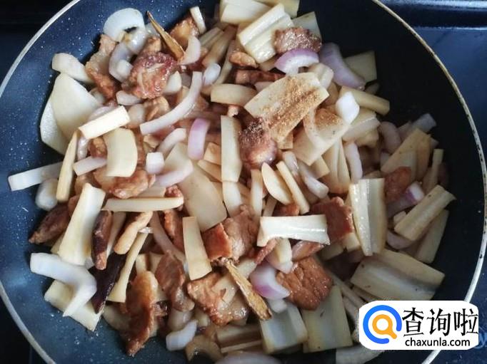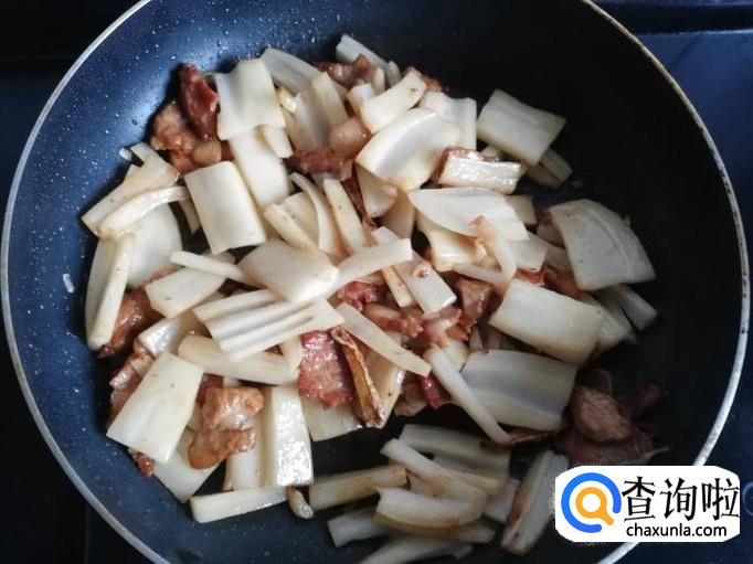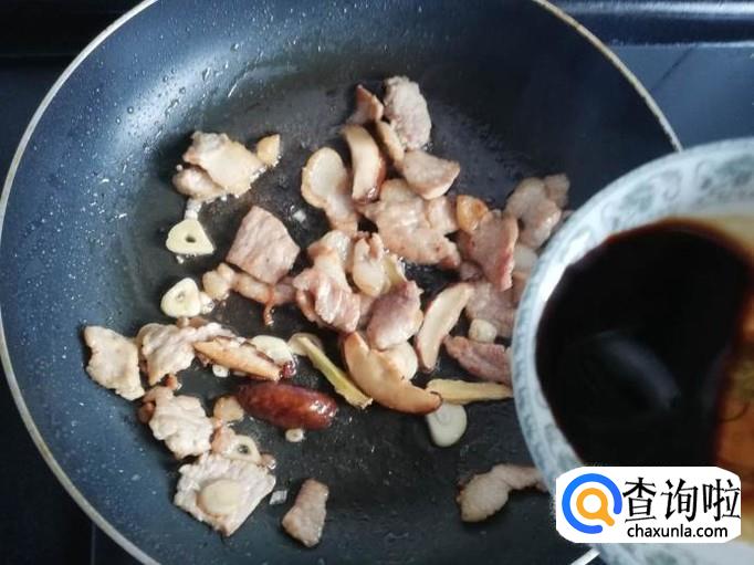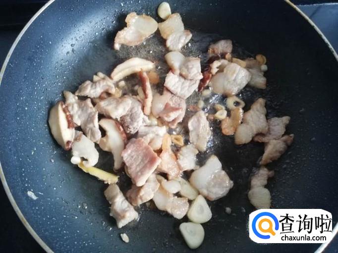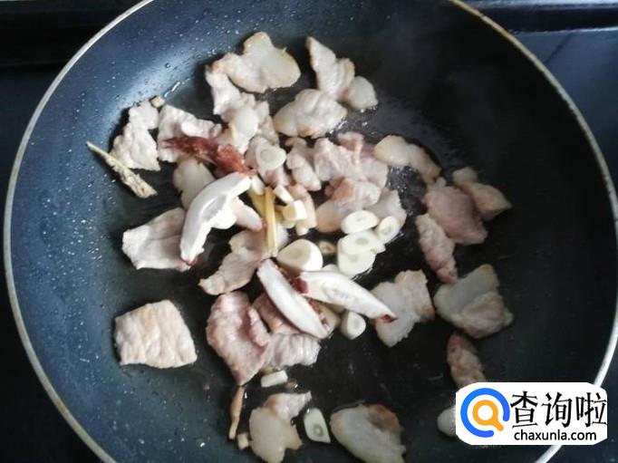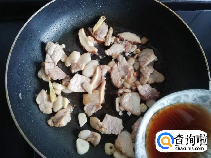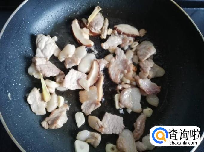 把猪肉表面的水分炒干,香菇和姜蒜下锅翻炒