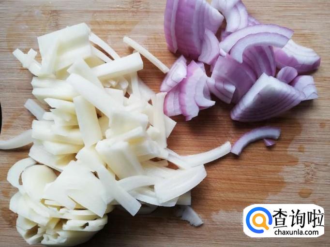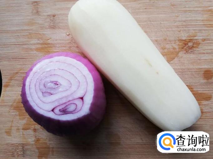 洋葱剥掉外面的一层,切掉两头,取半个洋葱洗干净切丝,莲藕去皮,洗干净后切好