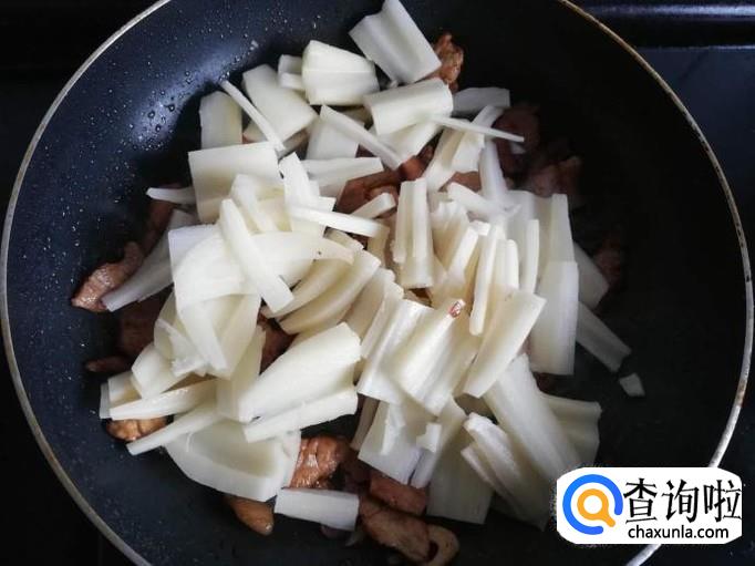 莲藕倒入锅中翻炒,炒至莲藕均匀的裹上油脂