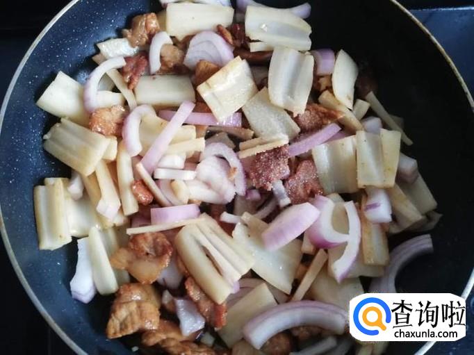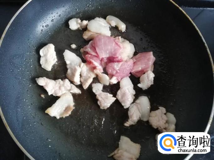 肥肉煸炒出油脂后,把瘦肉下入锅中翻炒